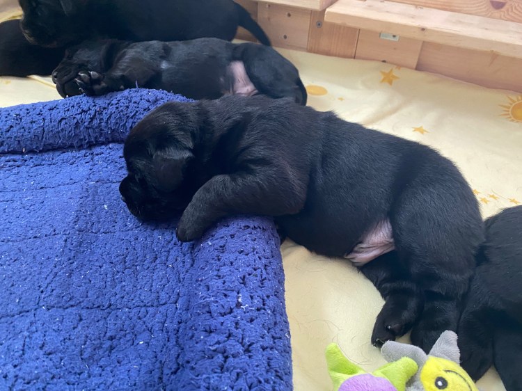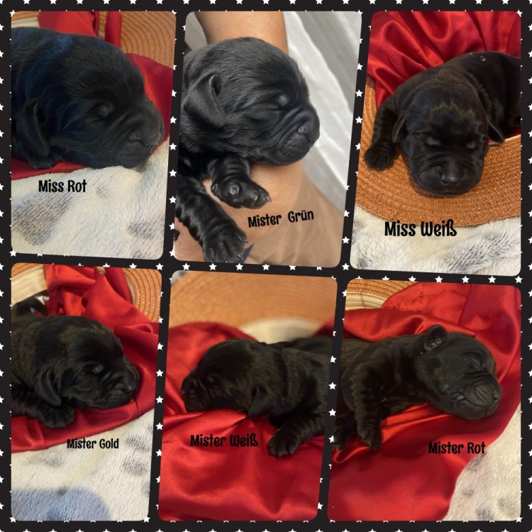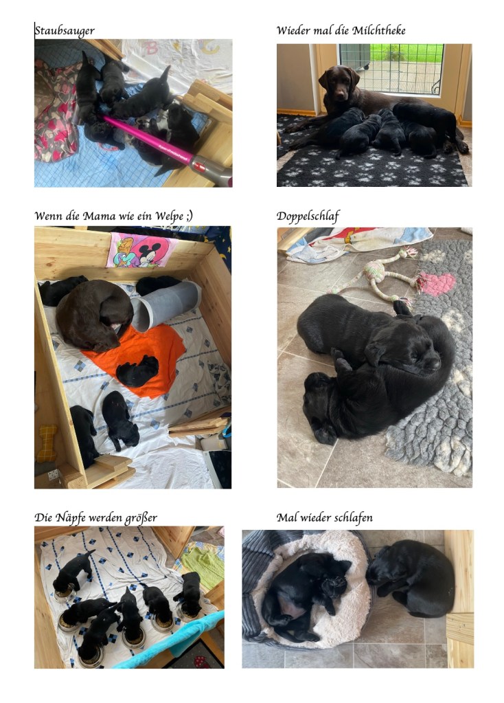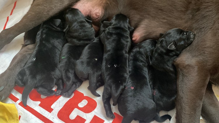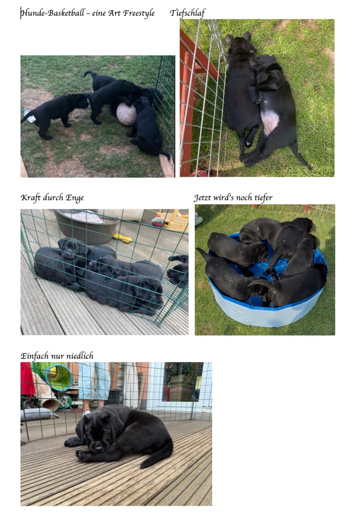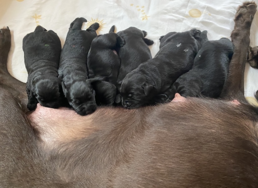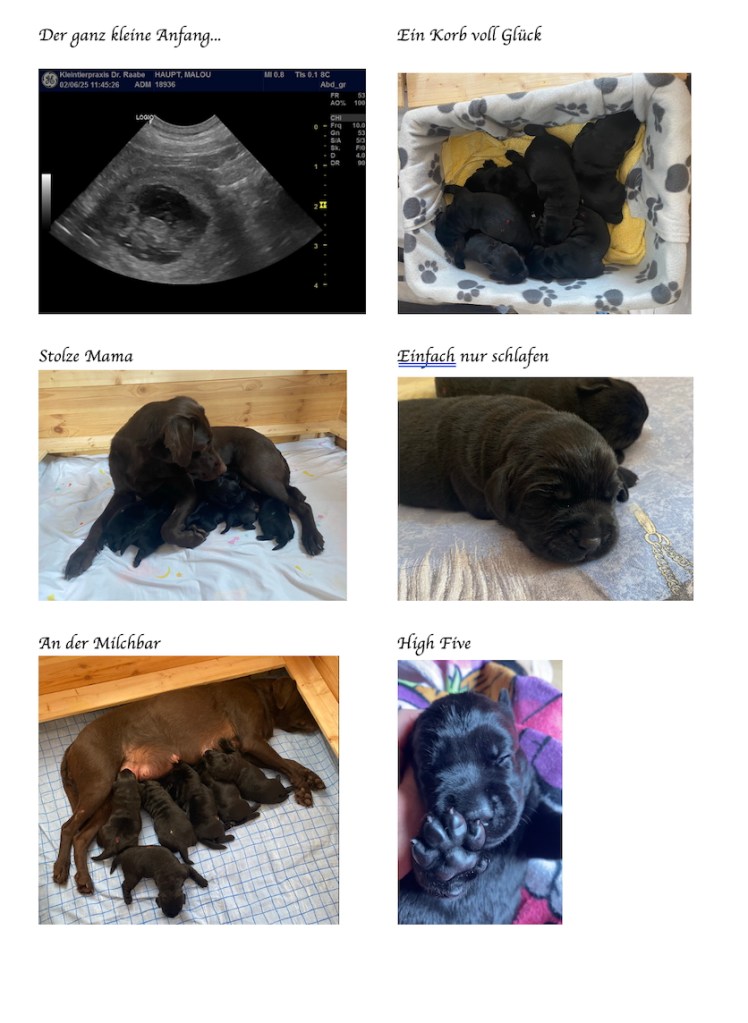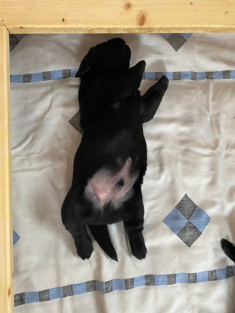 Am 5. Juli 2025 hat uns unsere liebe Malou ein Six-Pack von kleinen Lakritznasen beschert. Vier sehr vitale und kräftige schwarze Rüden und zwei ebenfalls schwarz-glänzende Mädels bereichern unseren Tageslauf – und ehrlich gesagt, nehmen diesen ziemlich ein ;).