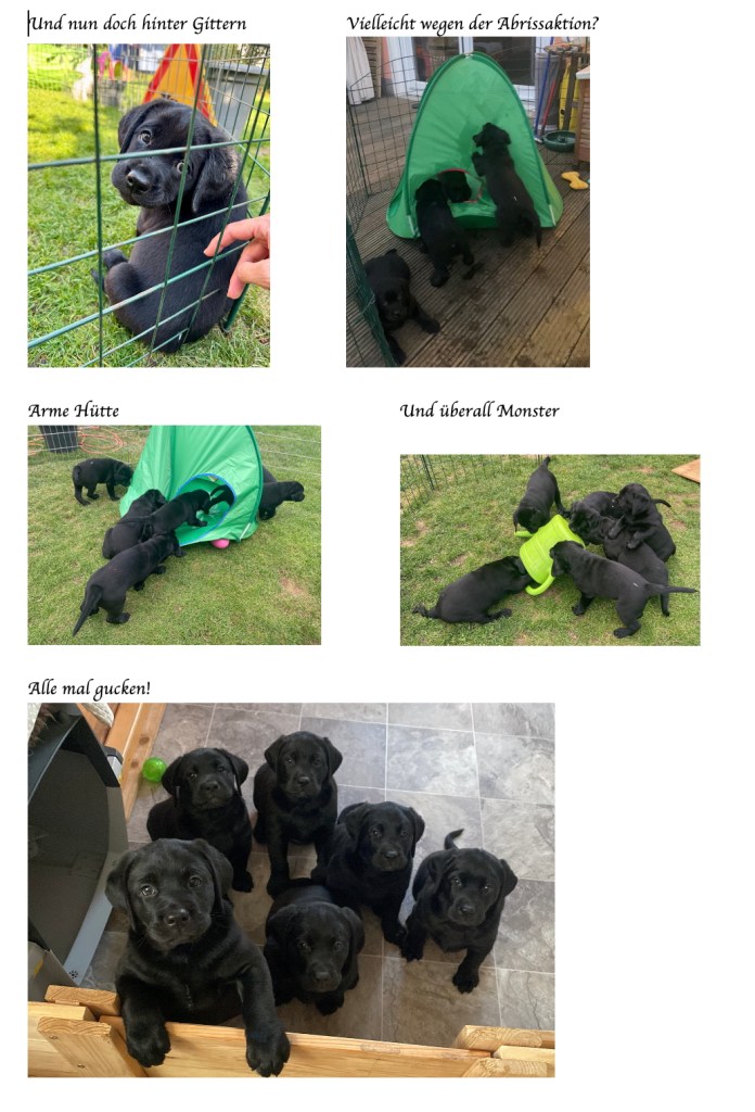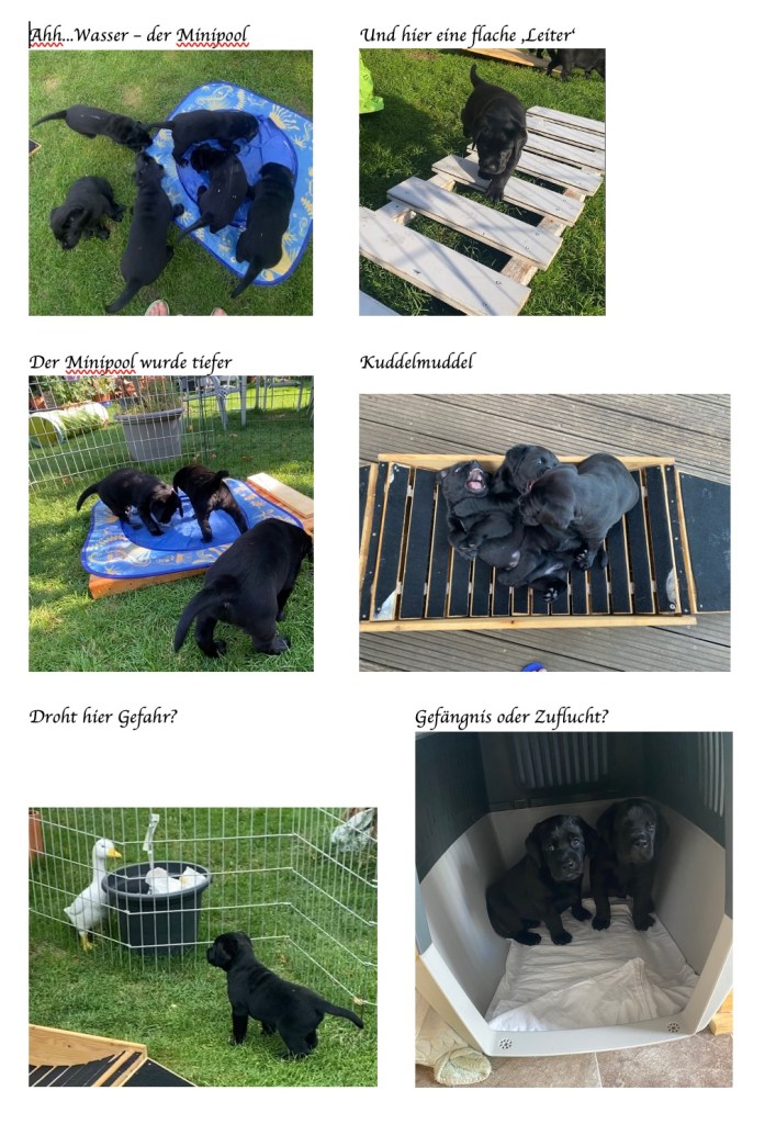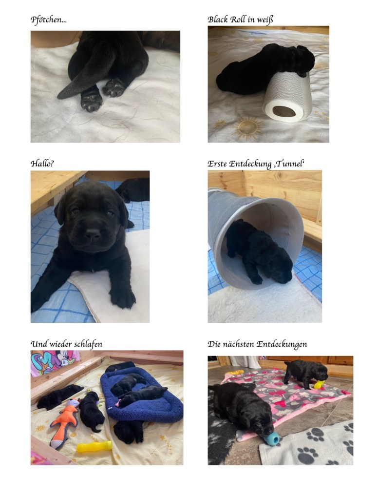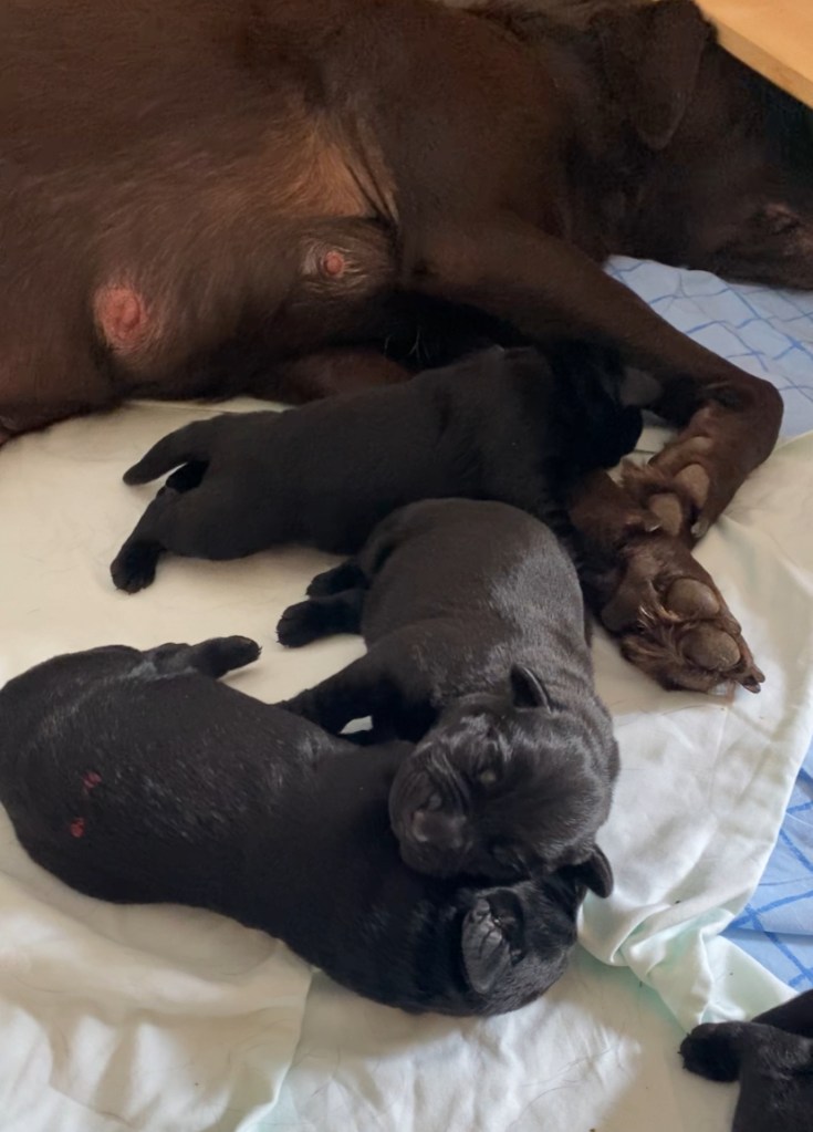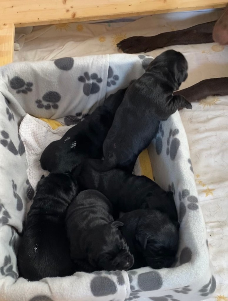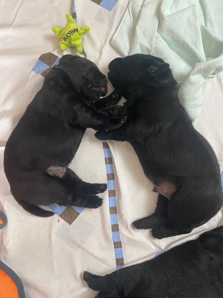 Am 5. Juli 2025 hat uns unsere liebe Malou ein Six-Pack von kleinen Lakritznasen beschert. Vier sehr vitale und kräftige schwarze Rüden und zwei ebenfalls schwarz-glänzende Mädels bereichern unseren Tageslauf – und ehrlich gesagt, nehmen diesen ziemlich ein ;).